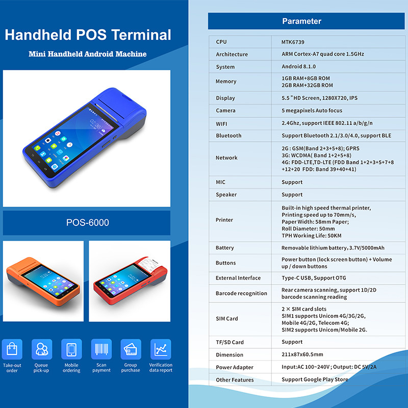 5.5インチ ハンドヘルド Android POSシステム キャッシュレジスターマシン タッチスクリーン モバイルPOSターミナル WiFi USB NFC 決済 小売用 ブルー 8