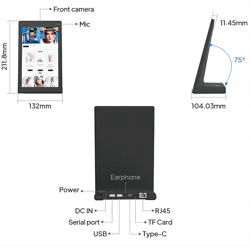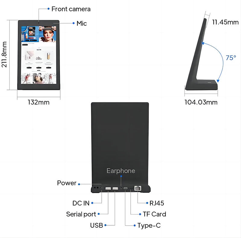 このAndroidタブレットは,キオスクスタイルのもので,受付のカウンター,ホテルのチェックインデスク,サービスステーション,スペースが限られているが,交流が頻繁な顧客タッチポイントに完璧にフィットするように設計されています.L型構造は,ゲストが自然に画面に近づき,スタッフの関与なしにフィードバックやサービスステップを完了できるように安定したエレガントな存在を提供します統合業者やディストリビューターにとって,このデバイスは,顧客サービスシステム,キュー管理,ゲスト評価プラットフォーム,軽量セルフサービスアプリケーションのための信頼できるハードウェア基盤を提供します.